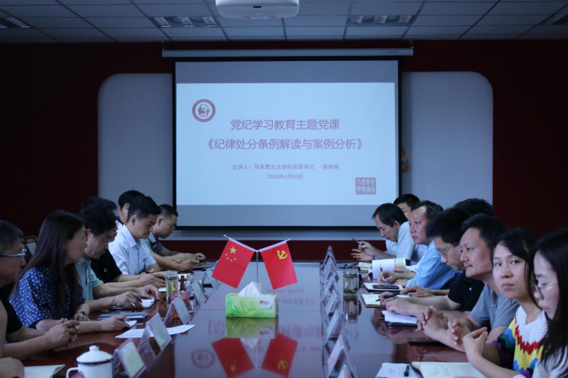 会上,谢依楠书记作题为《学纪立标杆清廉作表率》的专题党课,以引导广大党员知纪、明纪、守纪。她深入解读了纪律处分条例并进行案例分析,和大家一同观看视频《持续发力纵深推进》,深化以案说德、以案说纪、以案说法、以案说责,推动广大党员学纪、知纪、明纪、守纪。